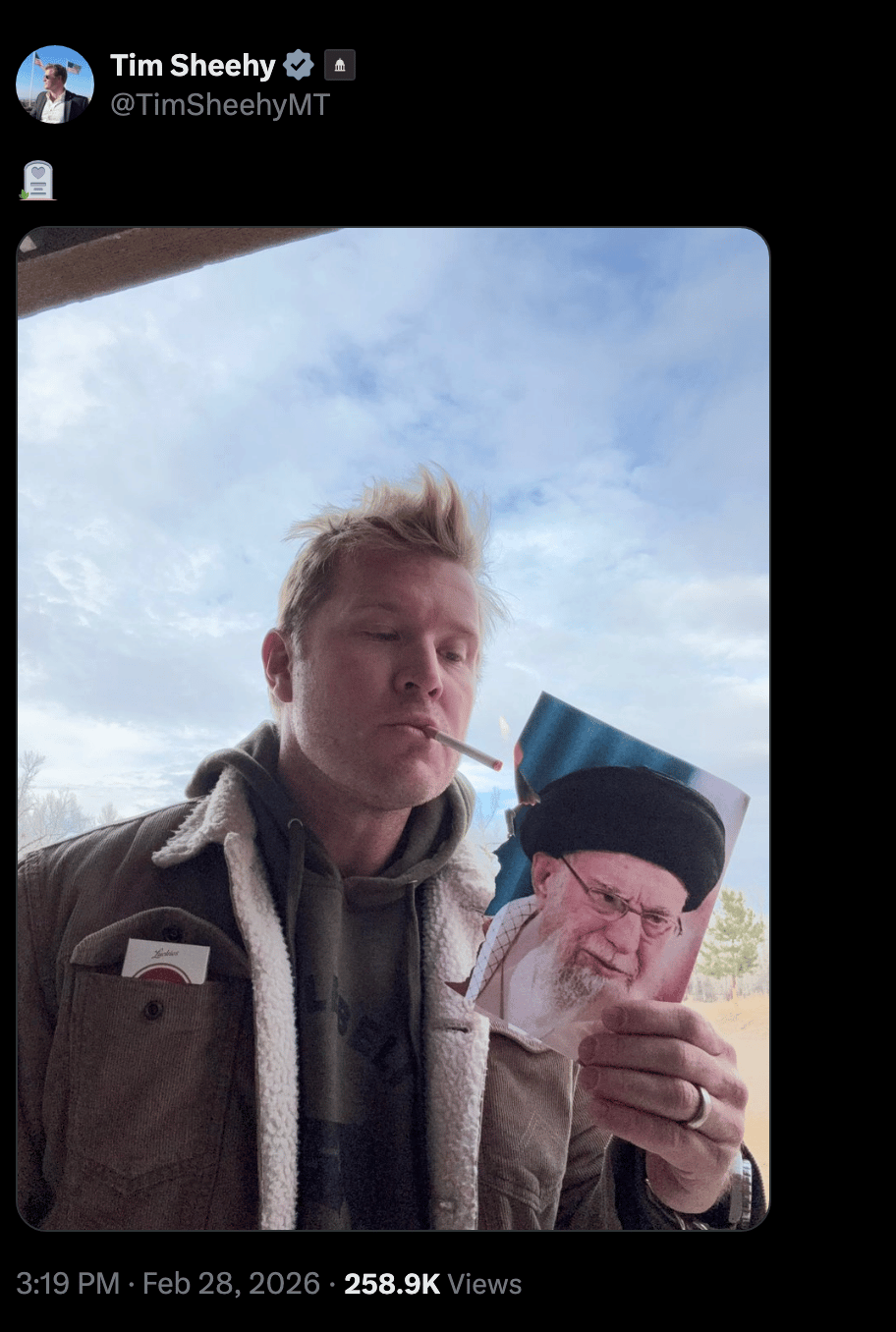 In an analysis, Montana Free Press reported that Sheehy, who is pro-Israel and a proponent of the U.S. war on Iran, posted an image of himself on Feb. 28 using a cigarette to burn a photo of former Iranian Supreme Leader Ayatollah Khamenei.